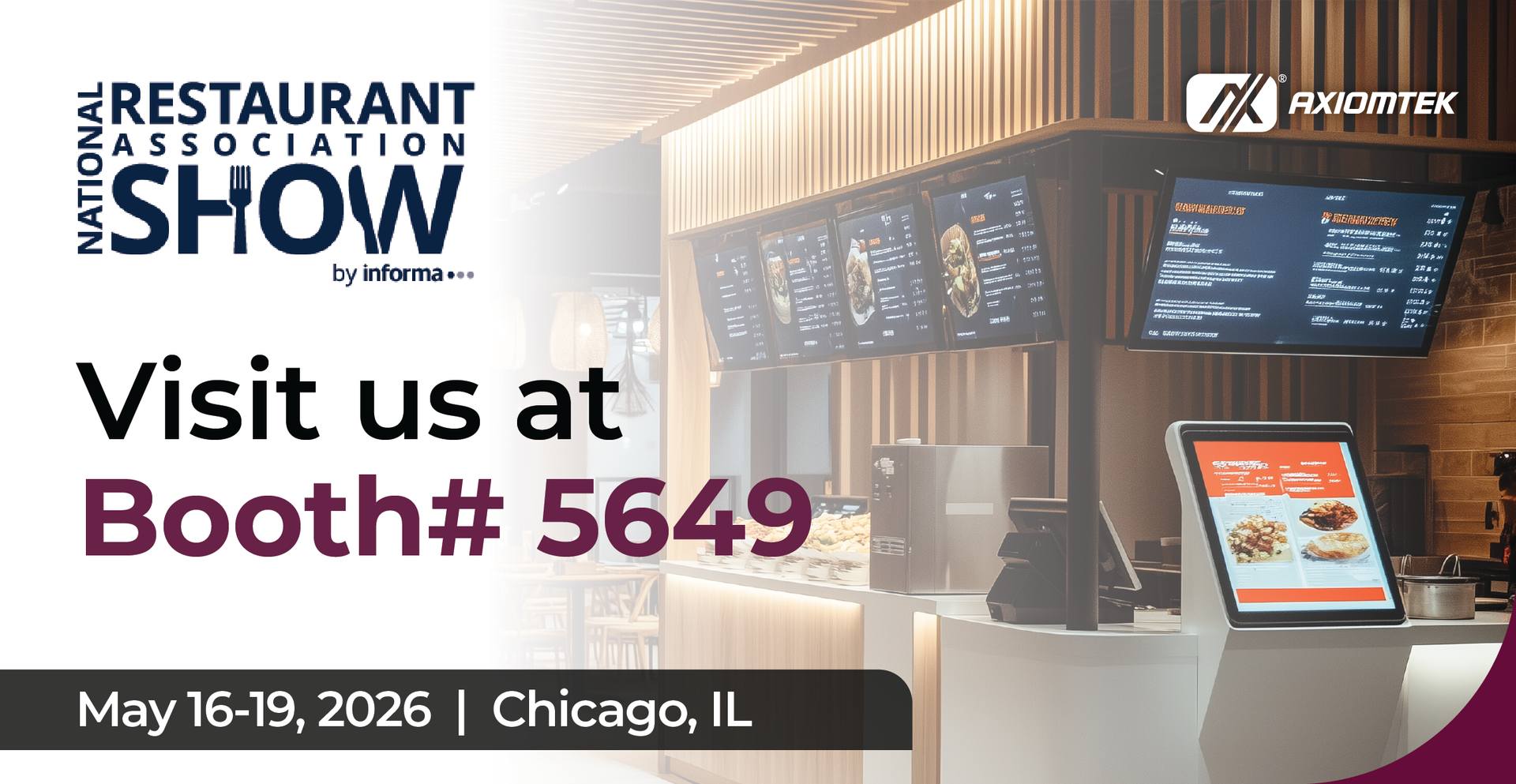 Success starts with the right ingredients. That's why we at Axiomtek are here to deliver customized solutions for your unique application. At this year's show, explore our full lineup of restaurant technology — including self-ordering kiosks and self-checkout terminals designed to reduce wait times and labor costs, high-performance digital signage players powering 4K menu boards, in-store promotional displays, AI-powered drive-thru solutions, and amplifier system for multi-input audio control. Our solutions are here to give you seamless command over all audio and visuals across every zone of a restaurant or retail an store.